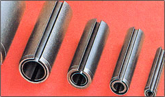 The spring pin means the pin having the function of spring that is called roll pin or self-lock pin. In general, the spring pin is made through this process: a steel band is molded into a cylinder-shape and then, gaps are given to it in the vertical direction, which is inserted into a hole whose diameter is a little smaller than the outer diameter of the pin, By doing this, inner pressure works around the hole, which prevents the pin from separating. The steel band should be heat-treated so it gets to have sufficient strength against the shear force, Compared with the parallel pin, its inside is empty so it is light. The end (one or both) of the pin is rounded for easy insertion into the hole.